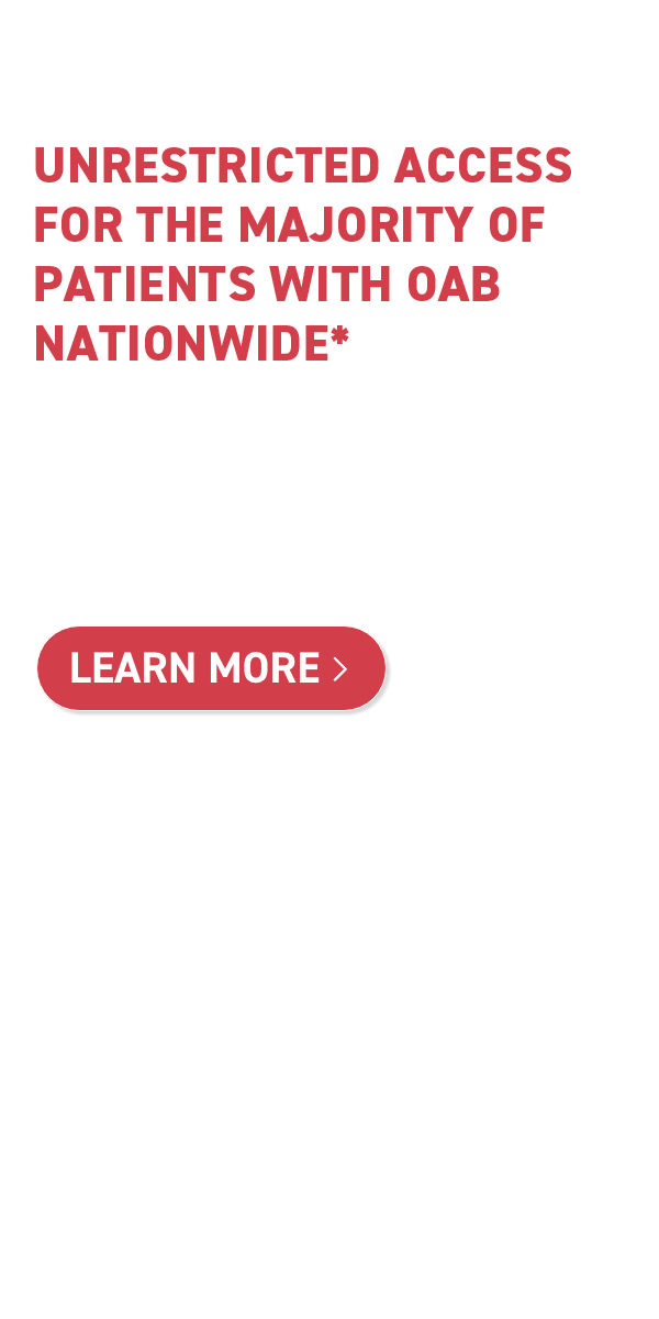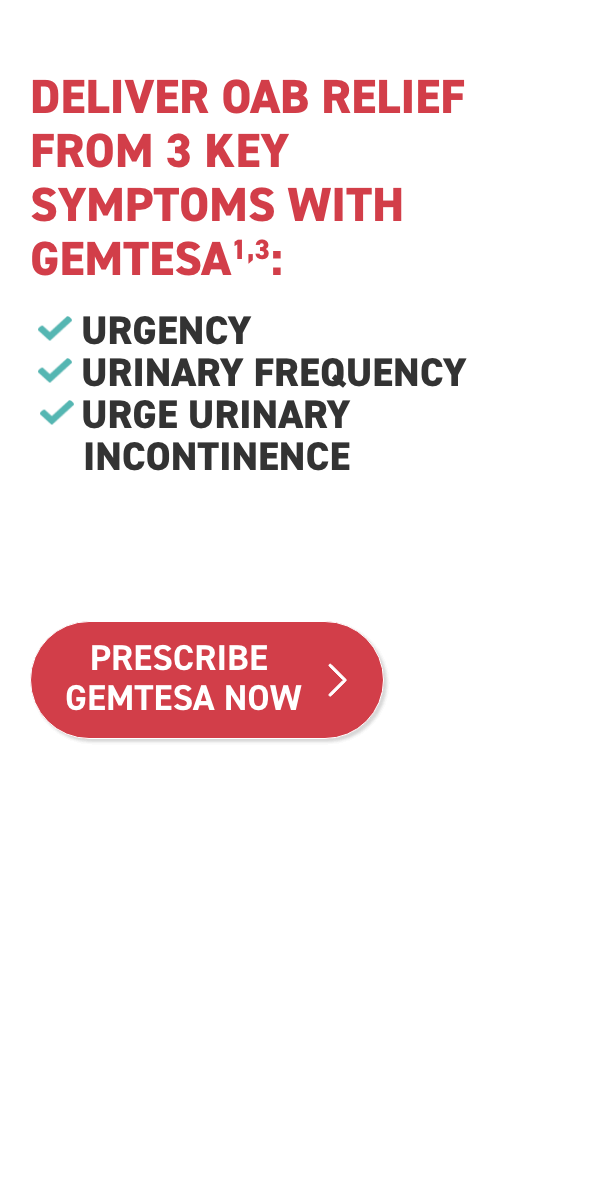References: 1. GEMTESA. Prescribing Information. Marlborough, MA; Sumitomo Pharma America; 2025. 2. Data on file. Sumitomo Pharma America, Inc. 3. Edmondson SD, Zhu C, Kar NF, et al. Discovery of vibegron: a potent and selective β3 adrenergic receptor agonist for the treatment of overactive bladder. J Med Chem. 2016;59(2):609-623. doi:10.1021/acs.jmedchem.5b01372